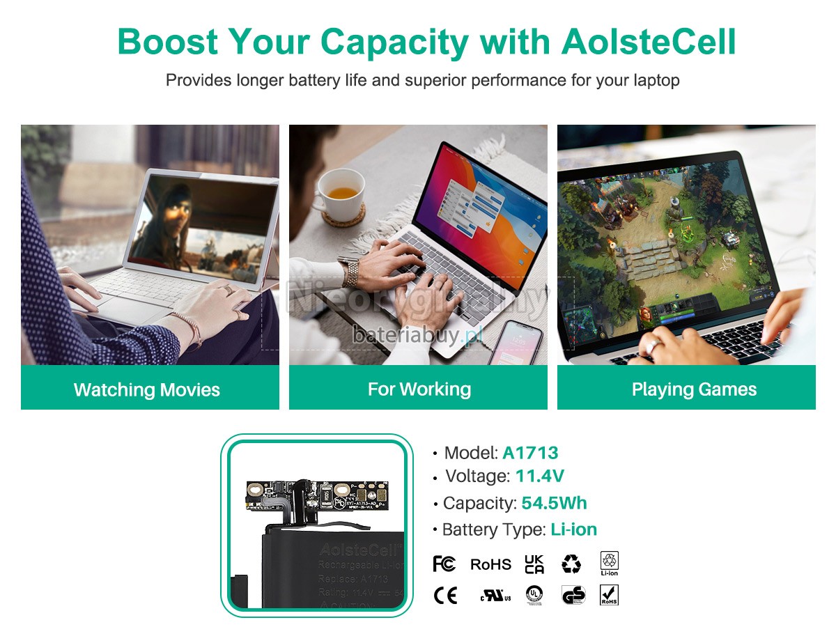 - Wymienna baterii w laptopie Apple MacBook Pro Core I7 2.4GHZ 13.3 inch Retina A1708(EMC 2978) wykorzystuje najwyższej jakości akumulatory litowo-jonowe i komponenty do szybszego ładowania i dłuższej żywotności.