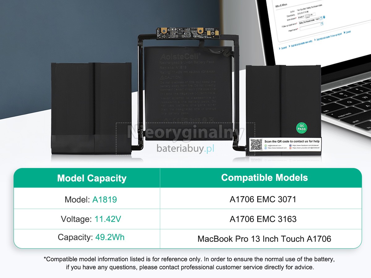 W rzeczywistości, dzięki ulepszeniu technologii baterii, żywotność bateria do Apple MPXV2LL/A ulegnie poprawie. Dostarczane przez nas akumulatory są wykonane z wysokiej jakości baterii i komponentów, dzięki czemu każda bateria ma wysoką wydajność, a ładunek cykliczny osiąga ponad 500 razy. Technologia litowo-jonowa przyspiesza ładowanie akumulatora, nie ma tak zwanego "Efektu pamięci".Każda bateria jest modelem specyficznym dla konkretnego modelu notebooka, a każdy projekt zwraca uwagę na szczegóły. Nowe bateria Apple MPXV2LL/A są na ogół bardziej energooszczędne, a akumulatory o tej samej pojemności działają prawidłowo i mają dłuższą żywotność. Nasza specjalizacja i koncentracja w branży baterii do laptopów oznacza, że możesz łatwo znaleźć odpowiednią bateria do laptopa i zaoszczędzić sporo pieniędzy. Jeśli masz jakiekolwiek problemy bateria do laptopa Apple MPXV2LL/A, skontaktuj się z nami przez e-mail, chętnie pomożemy Ci rozwiązać problem.