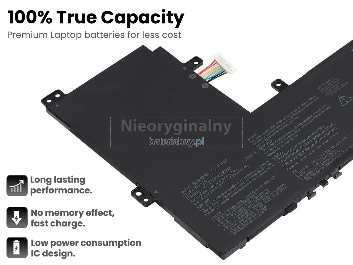 - Wymienna baterii w laptopie Asus C21N1807 wykorzystuje najwyższej jakości akumulatory litowo-jonowe i komponenty do szybszego ładowania i dłuższej żywotności.