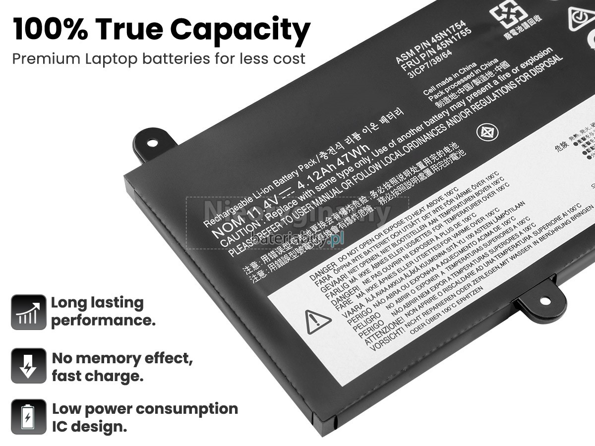 - Wymienna baterii w laptopie Lenovo 45N1754 wykorzystuje najwyższej jakości akumulatory litowo-jonowe i komponenty do szybszego ładowania i dłuższej żywotności.