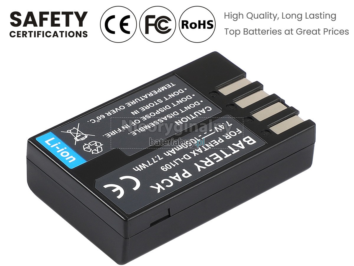 - Obudowa baterii wykonana jest z wysokiej jakości tworzywa sztucznego, które idealnie dopasowuje się do urządzenia PENTAX.