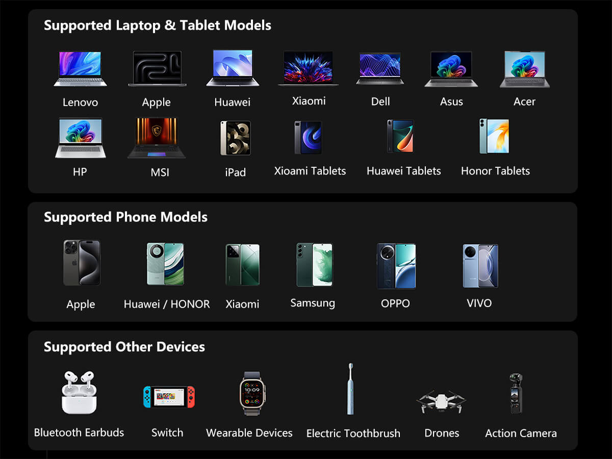 Dla maksymalnej wygody powerbank został wyposażony w wbudowany, zwijany kabel Type-C o długości 70 cm, obsługujący szybkie ładowanie do 100W (20V/5A) — bez potrzeby noszenia dodatkowych kabli. Urządzenie posiada również pełnofunkcyjny port Type-C (100W wejście/wyjście) oraz dwa porty USB-A o mocy do 22,5W, umożliwiające jednoczesne ładowanie kilku urządzeń. Od laptopów i tabletów, przez smartfony i konsole przenośne, po drony, kamery sportowe i akcesoria Bluetooth — ten powerbank poradzi sobie z nimi wszystkimi.