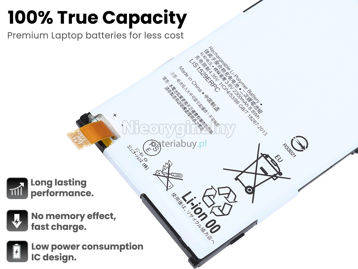 - Wymienna bateria Sony XPERIA Z1 MINI D5503 wykorzystuje najwyższej jakości ogniwa litowo-jonowe i komponenty, zapewniając szybsze ładowanie oraz dłuższą żywotność.